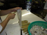 | 獲れたての鮮魚の太刀魚を三枚におろします。きれいに水洗いをした太刀魚を竹に巻いていきます。まずはタレを付けずに白焼きにします。その後、秘伝の自社製タレを付けて焼き上げます。このタレ付け・焼きの作業を繰り返して出来上がりです。表面はパリッと中はふっくら、一度味わってみてください。 |